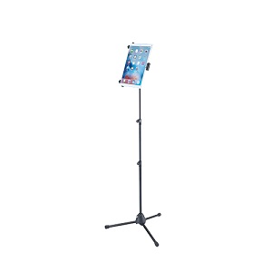De combinatie van de standaard en de universele tablethouder ondersteunt u op het podium, thuis of in de studio. De individueel verstelbare steunarmen kunnen worden gebruikt voor het gebruik van tablets in de hoogte van 222 tot 334 mm en breedte van 128 tot 232 mm (bijvoorbeeld iPad, iPad Air, iPad Pro, Amazon Fire HDX 8.9, Samsung Galaxy Tab van 9.7, Google Nexus 9, Asus Transformer of Microsoft Surface evenals Surface Pro). De diepte van de tabletten kan variëren tussen 6 en 11 mm. Voor het eerste gebruik van de tablethouder worden de instellingen van de steunarmen gemaakt door de klemschroeven aan te passen aan de grootte en diepte van de tablet. Voor andere doeleinden kan de tablet snel en eenvoudig worden bevestigd en verwijderd door middel van een klikvergrendeling. Een handige vleugelmoer maakt het mogelijk om de hoek aan te passen, zodat elke gebruiker gemakkelijk zijn ideale individuele positie kan vinden. De tablet kan schakelen tussen staande en liggende posities. De tablet wordt op zijn plaats gehouden, er is geen gevaar dat de tablet zelf van positie verandert. De lichte en uitbreidbare standaard kan worden aangepast aan elke hoogte tussen 70 en 155 cm. Een kleine en compacte voetafdruk maakt deze standaard gemakkelijk te vervoeren.
