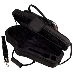 Voorgevormd altsaxofoon hoesje met nylon buitenkant, ruim buitenvak, zachte pluche voering en compartimenten voor nek en mondstuk.
